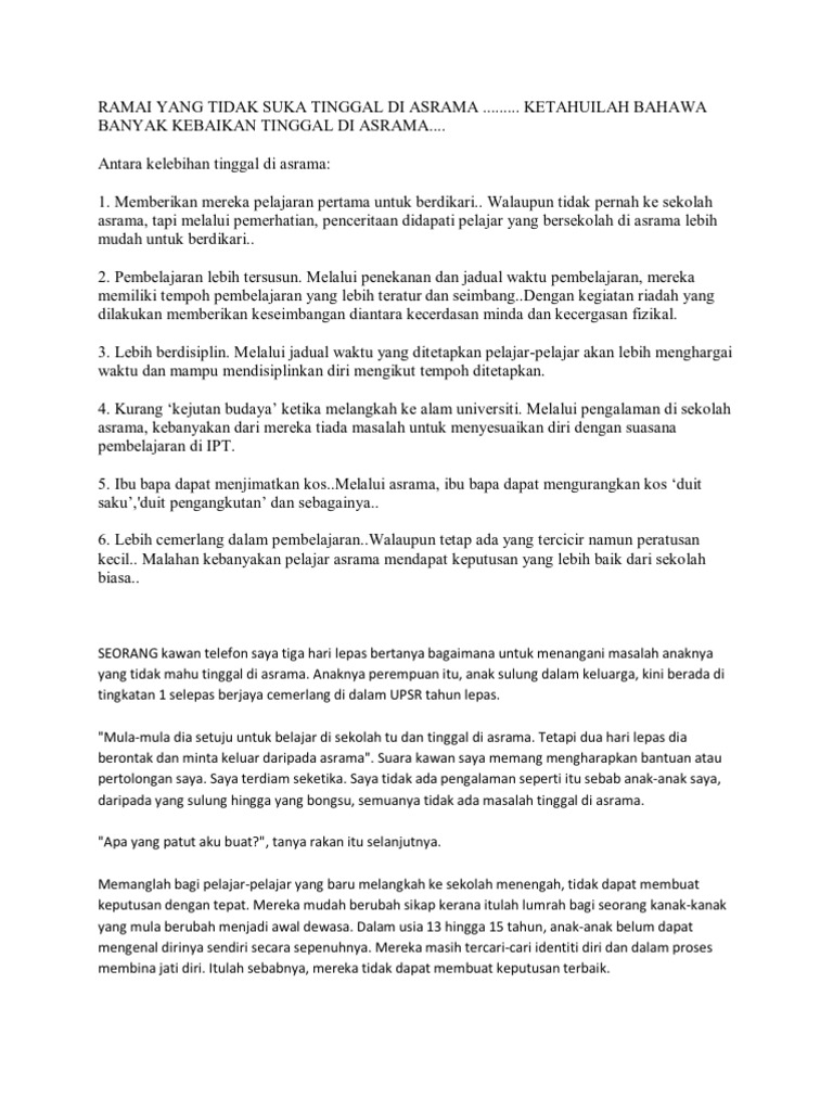 Kebaikan Tinggal Di Asrama from imgv2-2-f.scribdassets.com Jika tidak bisa tinggal lagi di asrama, mereka terancam hidup terlantar kembali karena ketiadaan tempat tinggal. Di asrama itu ada sembilan bangunan yang letaknya saling terpisah satu sama lain, dan kamar wali asuh berada di bangunan ke lima (dalam hitungan posisi yang saya buat). Mau ke forum supranatural tapi kayae kurang pas karena cuma share cerita aja. Antara kebaikan tinggal di asrama ialah pelajar akan mempunyai banyak masa untuk belajar. Di zaman rasulullah, terdapat komunitas sahabat yang tinggal di serambi (shuffah) masjid nabawi. Catur asrama juga dapat diartikan sebagai 4 (empat) tahapan hidup manusia yang harus di capai. Ketahuilah bahawa banyak kebaikan tinggal di asrama. Pendaftaran dan pembayaran untuk tinggal di asrama sudah selesai diurus beberapa minggu yang lalu.